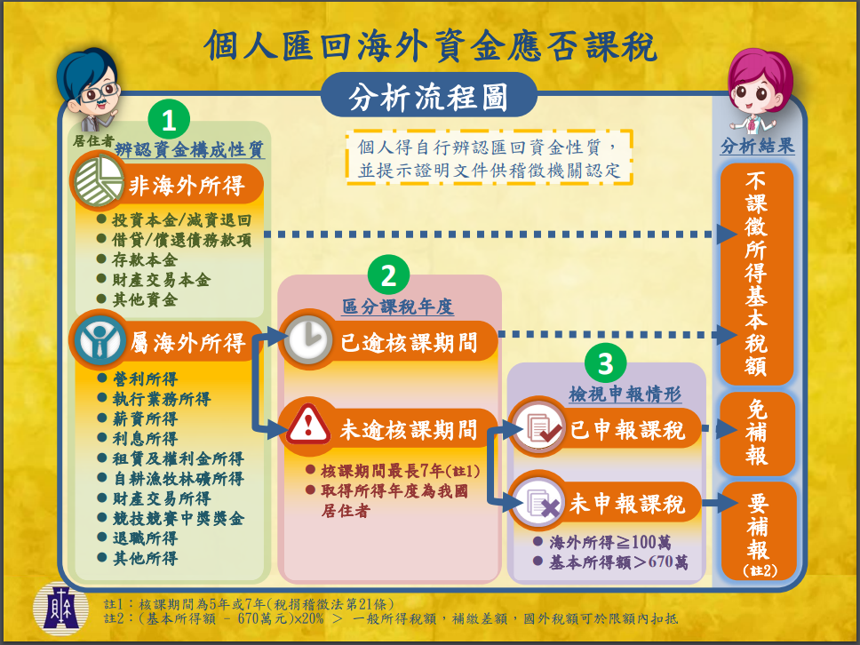 至於非屬上述3種情況,我國居住者個人如有核課期間內尚未申報課稅的海外所得,也可依稅捐稽徵法第48條之1規定自動補報,如有應補繳基本稅額,得適用海外稅額扣抵以避免重複課稅,又補繳的稅款除加計利息外,將免予處罰。該部並補充「個人匯回海外資金應否課稅分析流程圖」(詳附件),供外界參考。