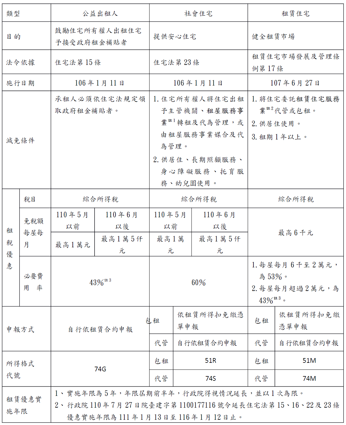 (二)透過「租屋服務事業」包租或代管之社會住宅:作為居住、長期照顧服務、身心障礙服務、托育服務、幼兒園使用,於出租期間所獲租金收入,自110年6月起每屋每月在1萬5千元以下(110年5月以前為1萬元),免納綜合所得稅,超過部分,以減除必要損耗及費用後餘額為租賃所得,如不逐項舉證費用,其必要損耗及費用為應稅租金收入60%。